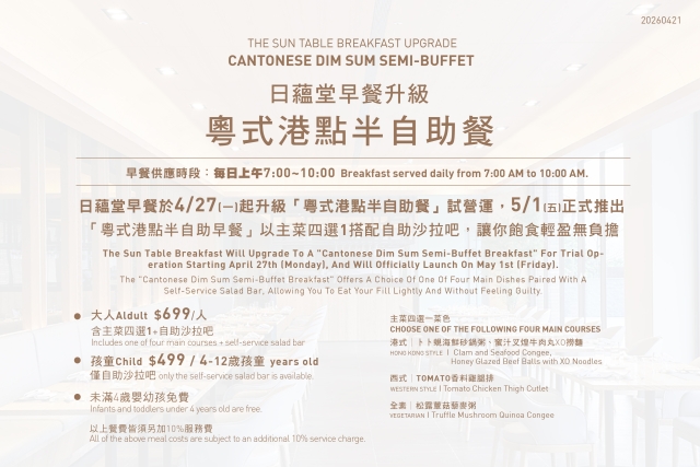 日蘊堂早餐於4/27(一)起升級「粵式港點半自助餐」試營運,5/1(五)正式推出。